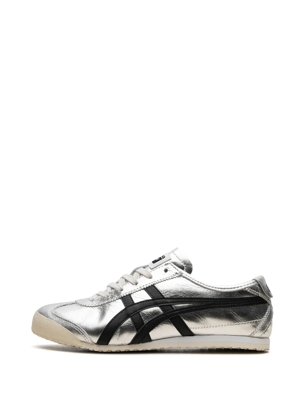 This is a retooled shoe released in 2023 of the original Mexico 66 model that was originally worn by Japanese athletes at the 1968 Summer Olympics in Mexico. The design features a slim style and low top. The upper is a sleek pure silver color and adorned with the iconic Onitsuka Tiger stripes in black. A cream-colored outsole with a reinforced toe area matches the flat laces of the same color. Additional branding is seen on the tongue and heel tab.